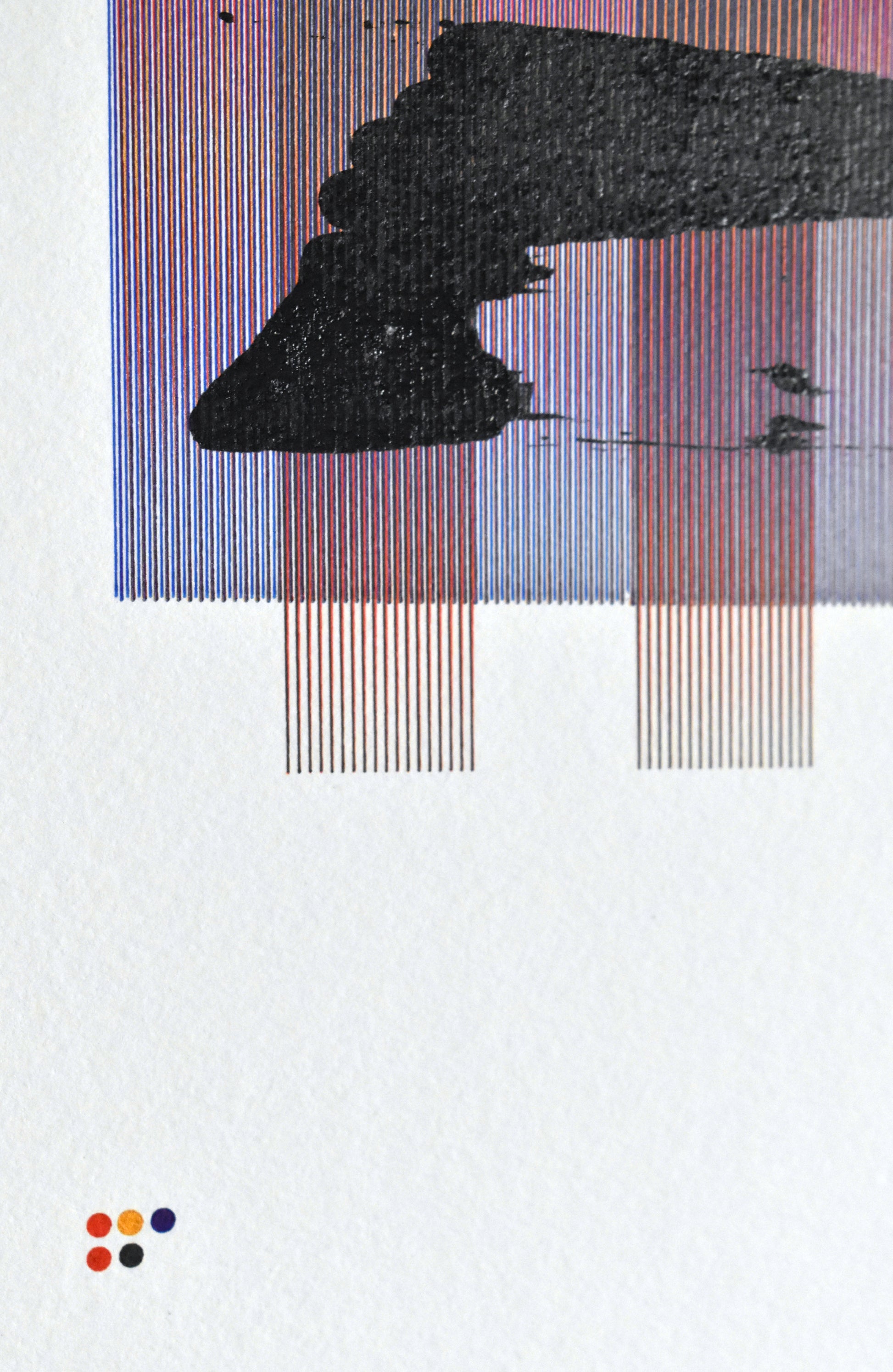 My favorite pen combo by far is the red, blue, gold, and black inks of the broad tipped Uni-ball UM-153 pens. The red and gold mix into these warm fire-like oranges and the blue and gold produce comforting hints of green. The addition of some black enamel adds to the sense of depth with the layering and often gives the piece a landscape feel. The white ink almost always comes in on the top as an accent as it blends with the paper it tends to send things back in space. In this piece I chose a white pen that was 95% empty so that the white would fade out quickly in an random location.