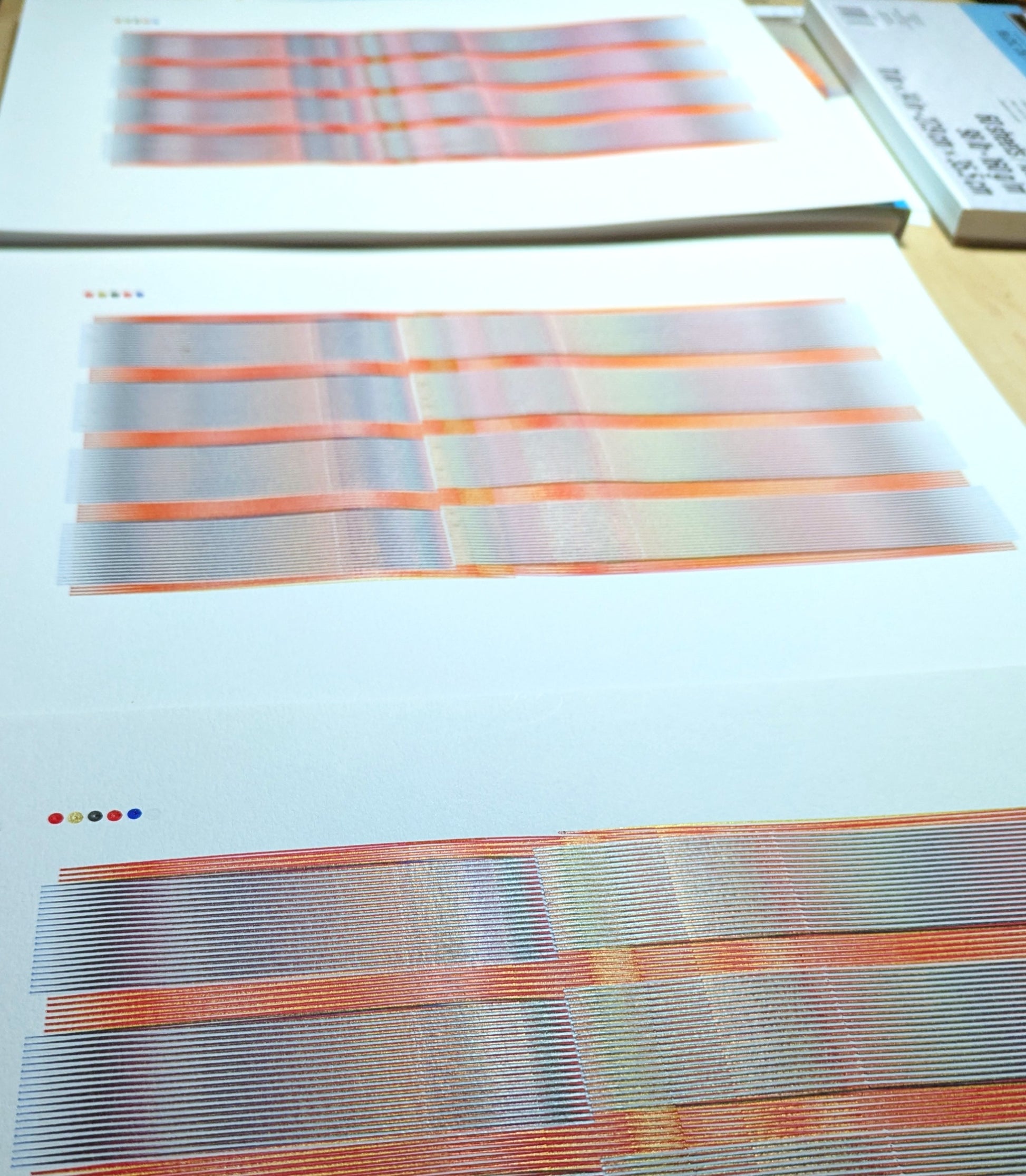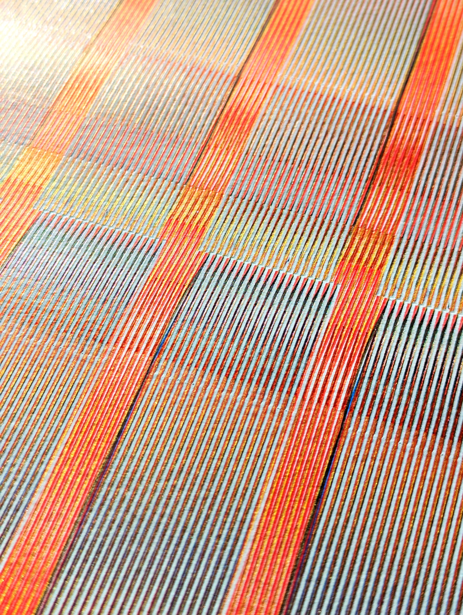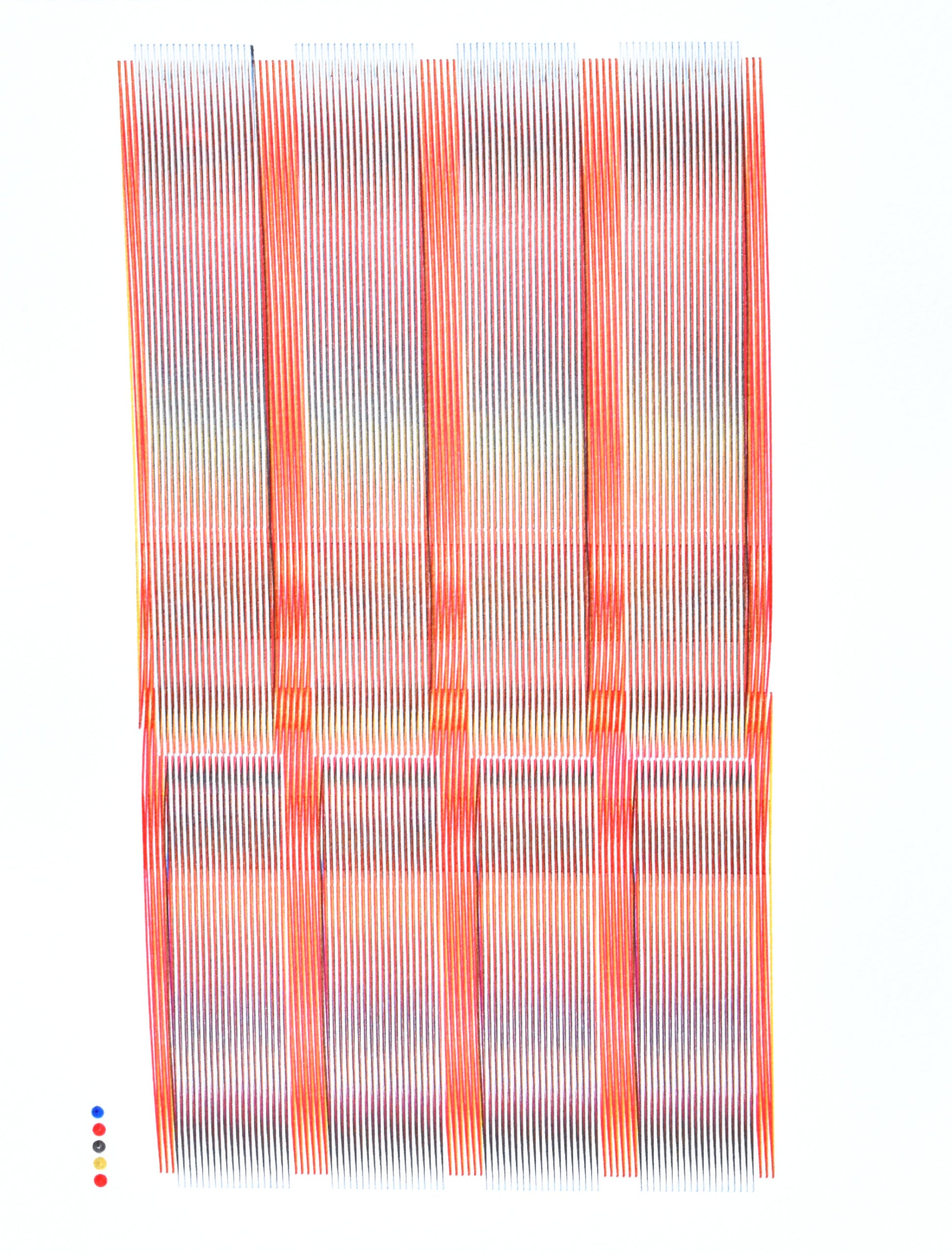Abstract print plotted with red, blue, black, gold, and white Uniball Signo UM-153 gel pens. Overlapping lines create a myriad of tones and textures that reveal themselves as light and viewing angles change.